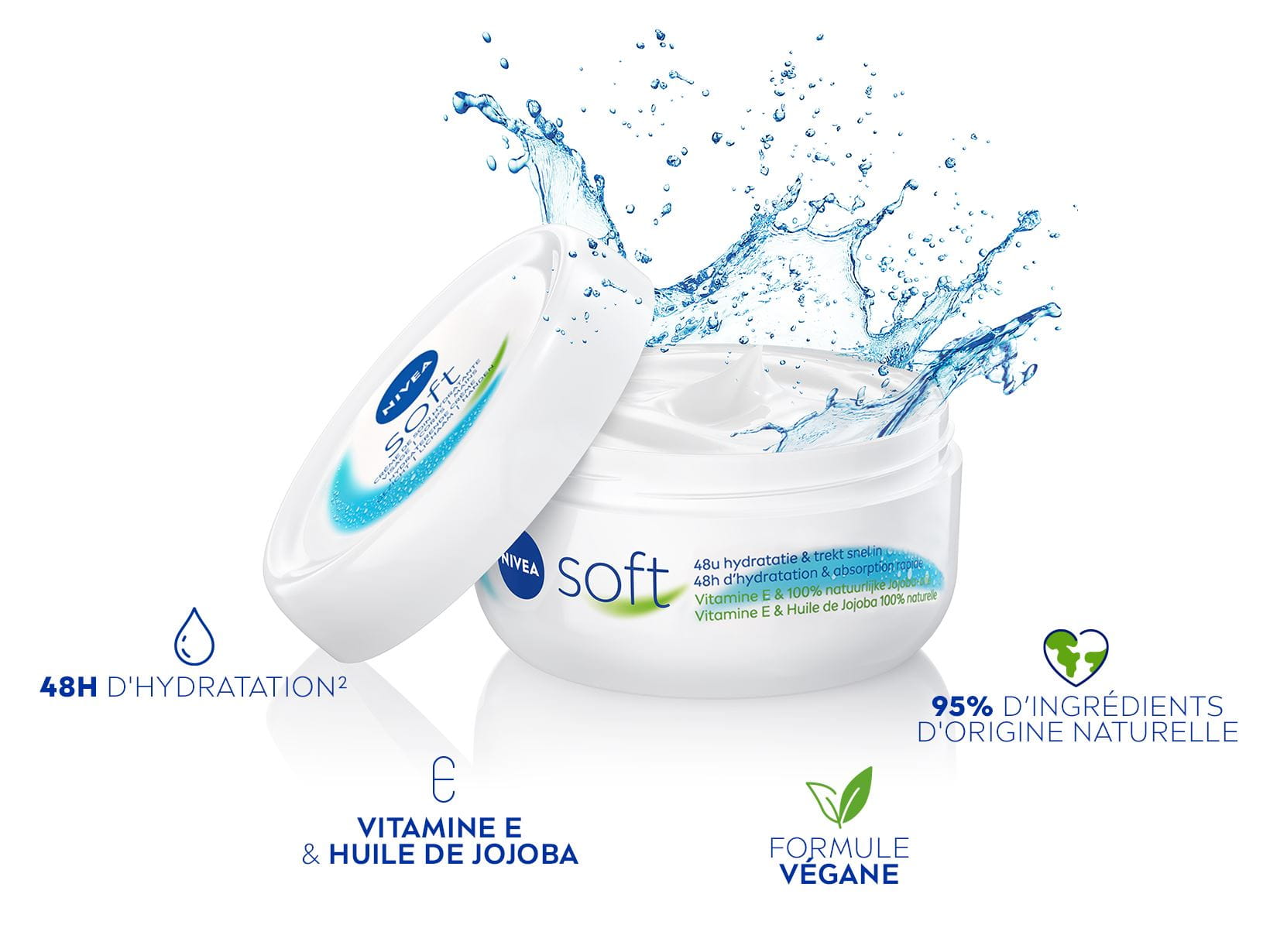 NIVEA Soft procure désormais à votre peau une hydratation pendant 48h2. La formule légère avec de la vitamine E et de l’huile de jojoba pénètre rapidement et laisse une agréable sensation de fraicheur. Elle contient désormais 95% d’ingrédients d’origine naturelle et est biodégradable à 98%3. Cela en fait la crème de soin idéale pour un usage quotidien - ceux qui l'ont déjà essayée vont tout simplement l'adorer !