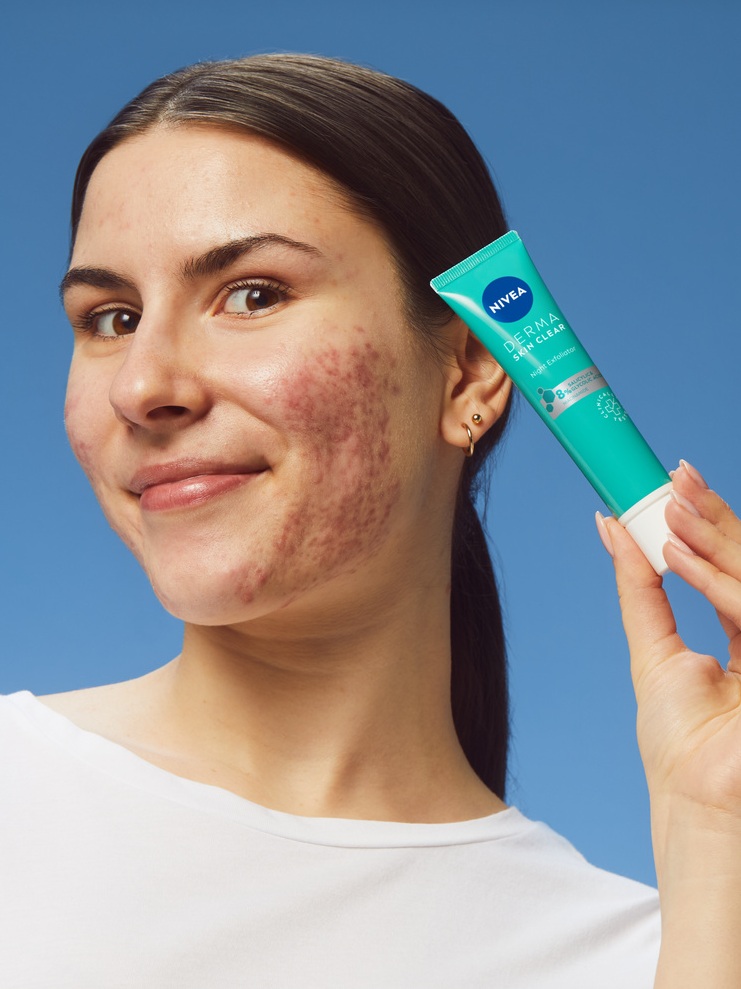 Essayez un gommage doux comme le NIVEA Derma Skin Clear Anti-Blemish Face Scrub, formulé avec de l’Acide salicylique et de la Niacinamide pour désobstruer les pores et améliorer la texture de la peau. Il convient à une utilisation 2–3 fois par semaine sur les peaux à imperfections.