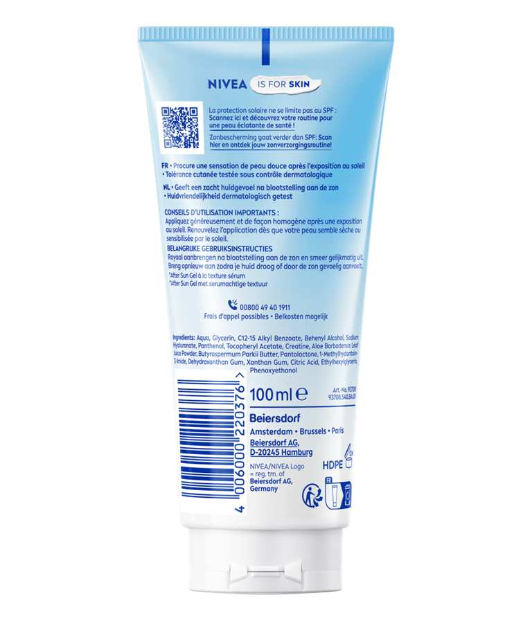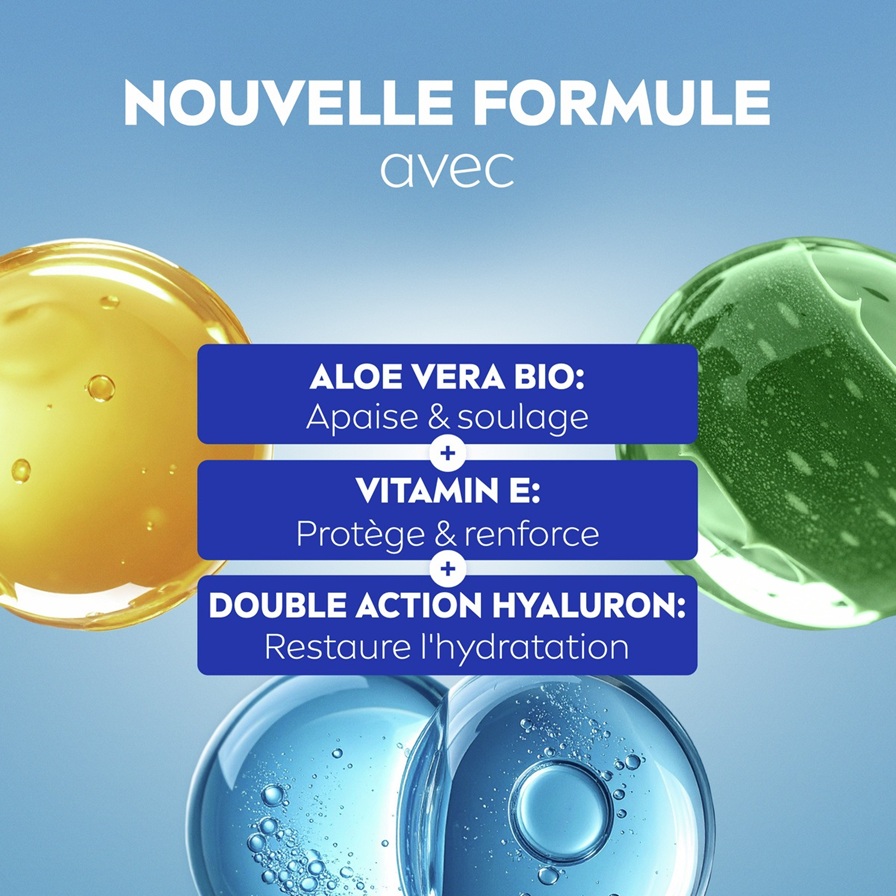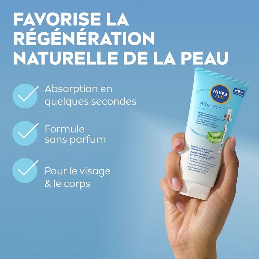 Réhydrate jusqu'à 100 % pendant la nuit et favorise le processus naturel de régénération et de réparation de la peau stressée par le soleil – Formule ultra-légère et sans parfum pour le visage et le corps : NIVEA SUN Gel-Sérum après-soleil