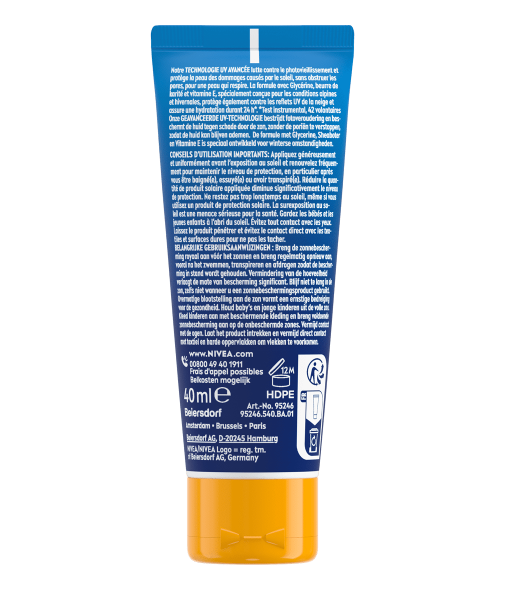 NIVEA SUN UV Face Alpin SPF 50+ lutte contre le photovieillissement sans obstruer les pores. Protège par temps froid et en hiver. Fournit une hydratation durant 24 heures*.