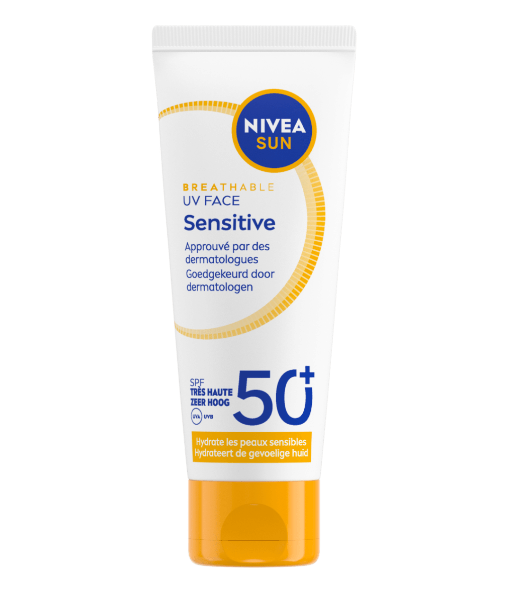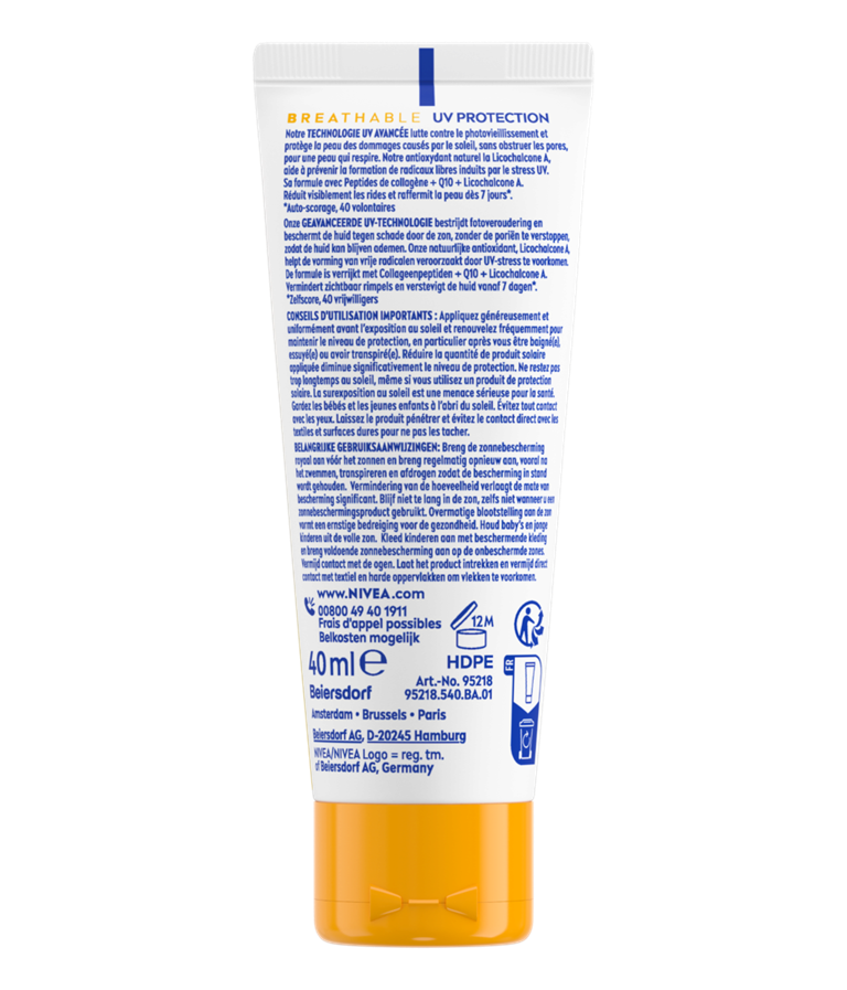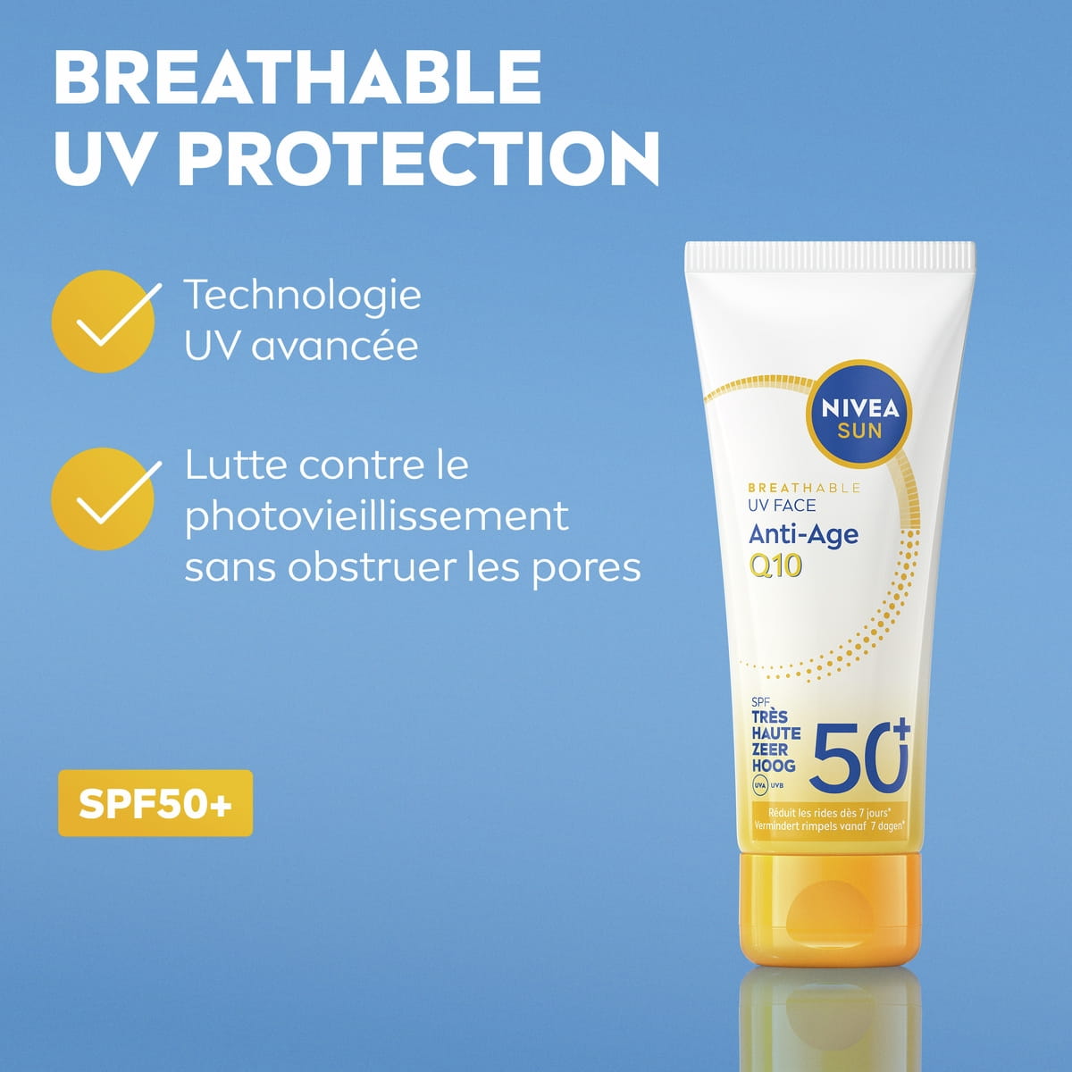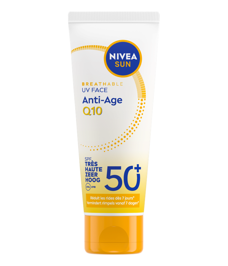 NIVEA SUN UV Face Anti-Age Q10 SPF 50+ lutte contre le photovieillissement sans obstruer les pores. Réduit les rides et raffermit la peau dès 7 jours*.