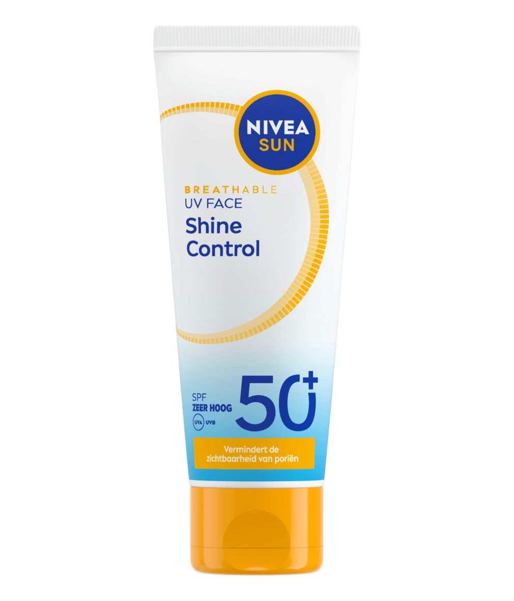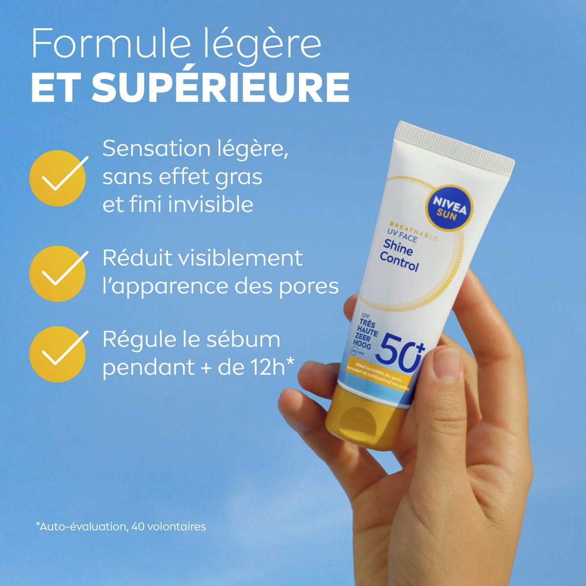 NIVEA SUN UV Face Shine Control SPF 50+ lutte contre le photovieillissement sans obstruer les pores. Régule le sébum pendant + de 12 heures* et réduit l'apparence des pores.