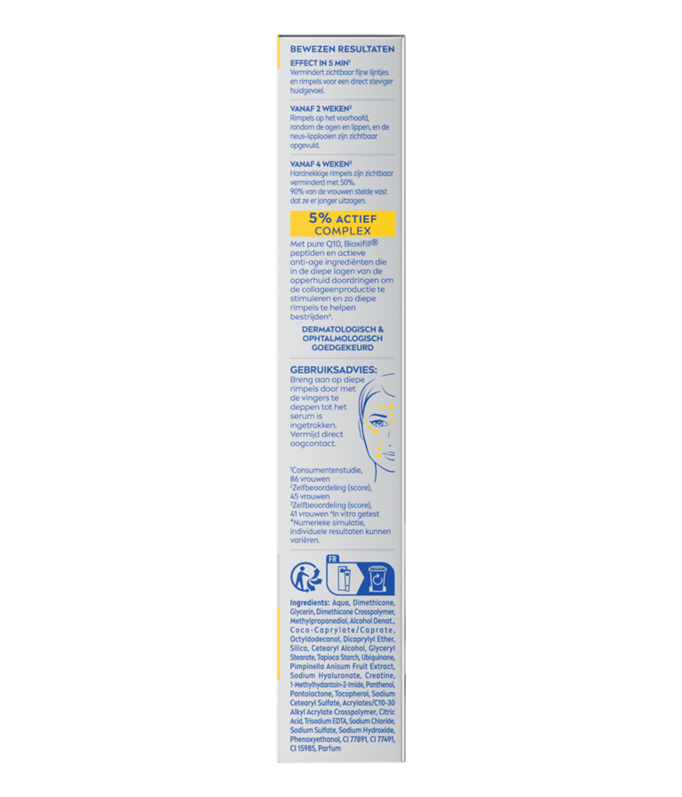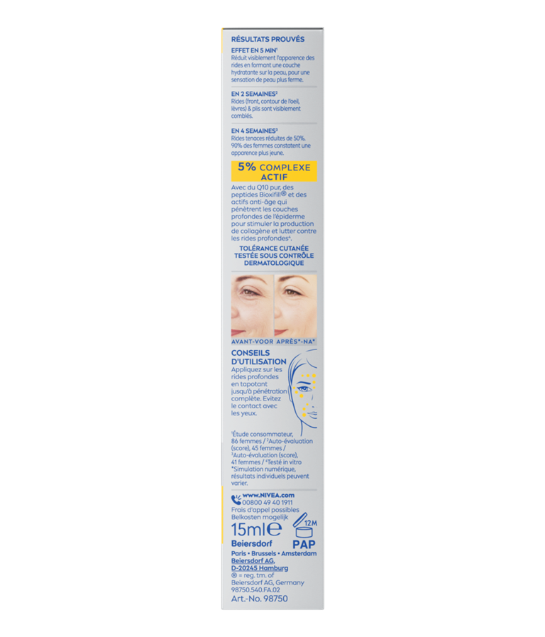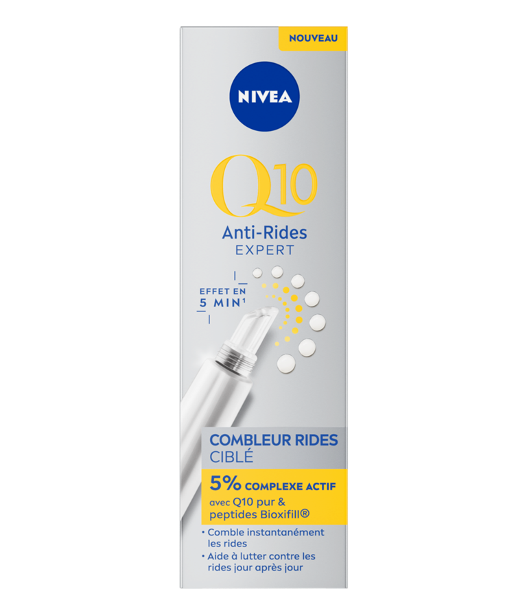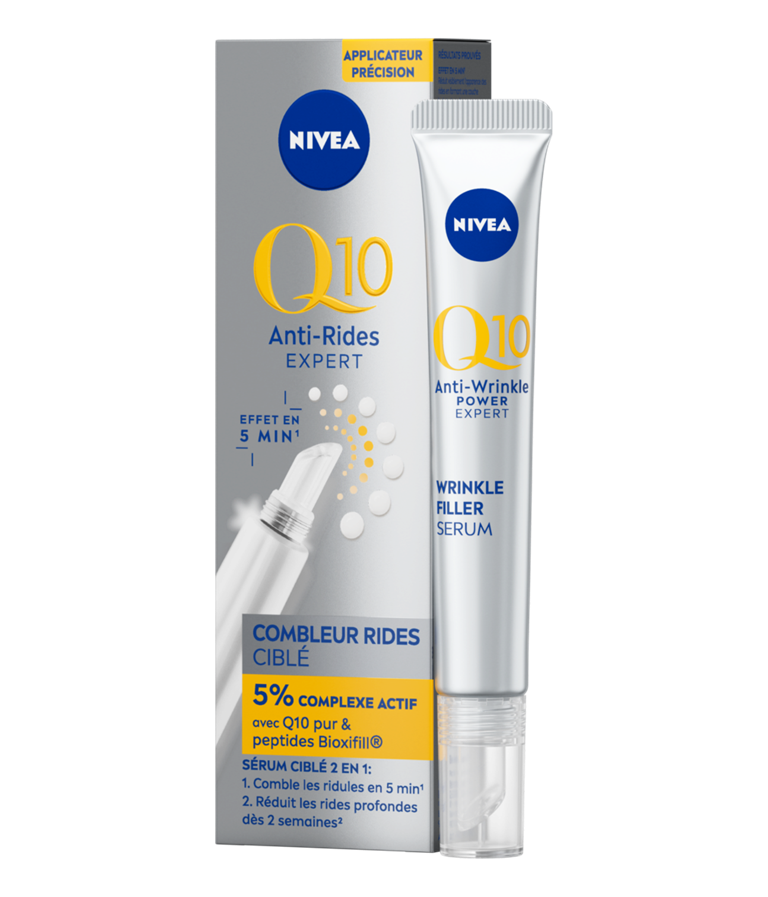 [Cet avis a été recueilli en réponse à une offre.] Je viens d utiliser le combleur de rides qui soi disant fait effet en 5 minutes...pour moi ras aucun changement méme minime...j ai aussi acheté la creme nivea q10en complement...à voir sur le long terme mais pour l instant ne tient pas ses promesses...j ai 60ans