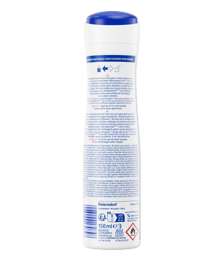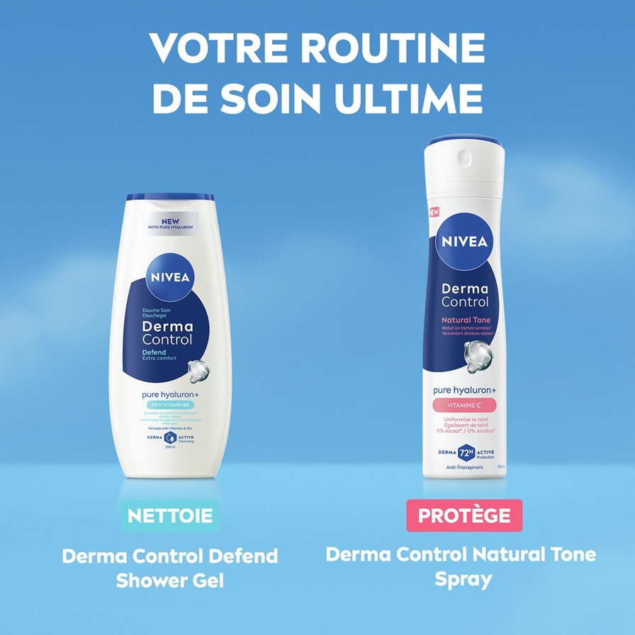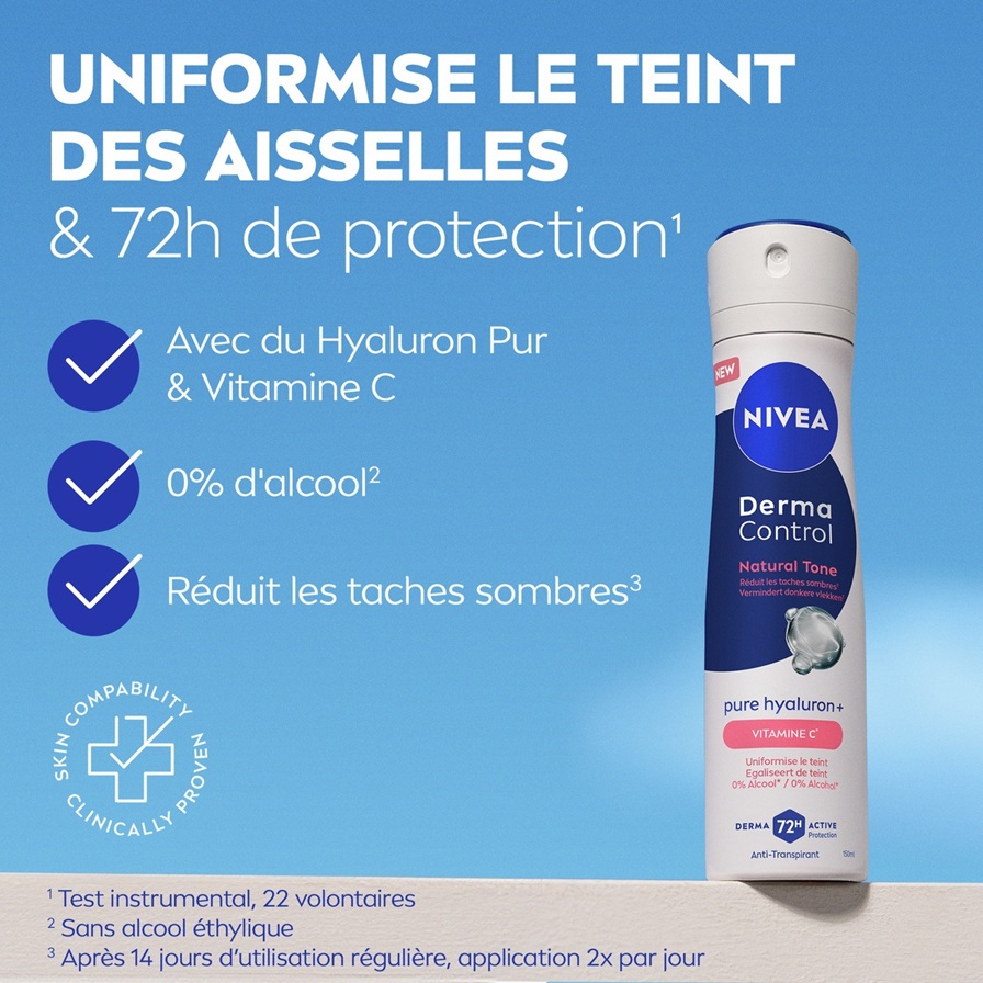 La gamme NIVEA Derma Control Natural Tone, enrichie en Acide Hyaluronique Pur et en Vitamine C, atténue les taches sombres et redonne un teint uniforme à la peau. Les anti-transpirants offrent une protection contre la transpiration et les odeurs pendant 72 heures, tout en laissant vos aisselles plus douces et plus belles, avec une sensation de peau saine.