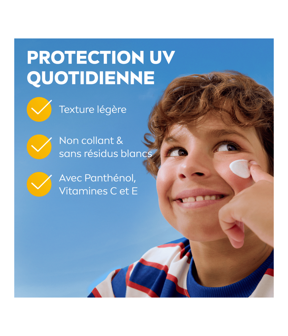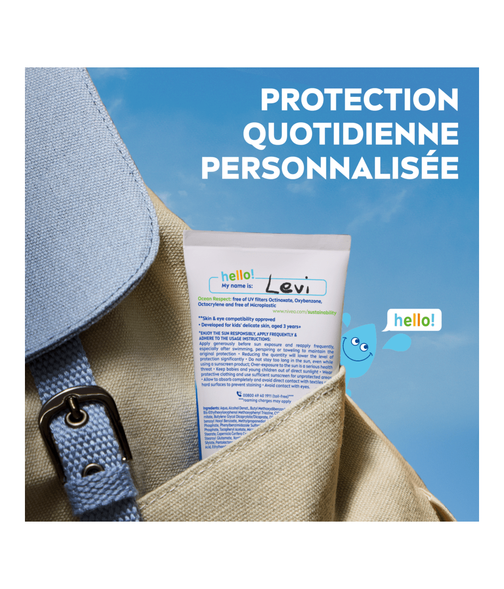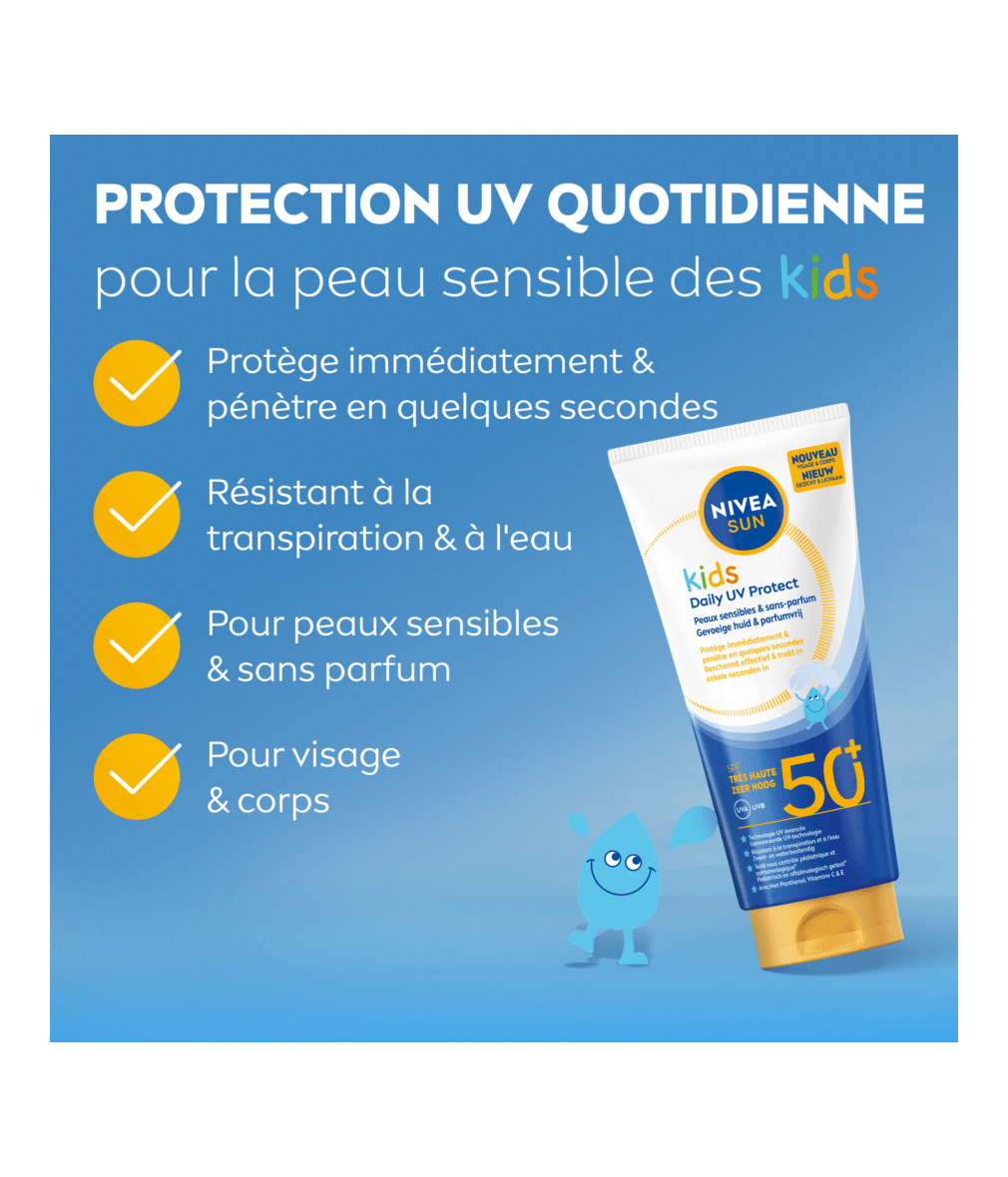 NIVEA Sun Kids Daily UV Protect SPF 50+ conçu pour la peau sensible des enfants. Il est sans parfum, s'absorbe rapidement et est résistant à la transpiration et à l'eau — parfait pour une utilisation quotidienne sur le visage et le corps.