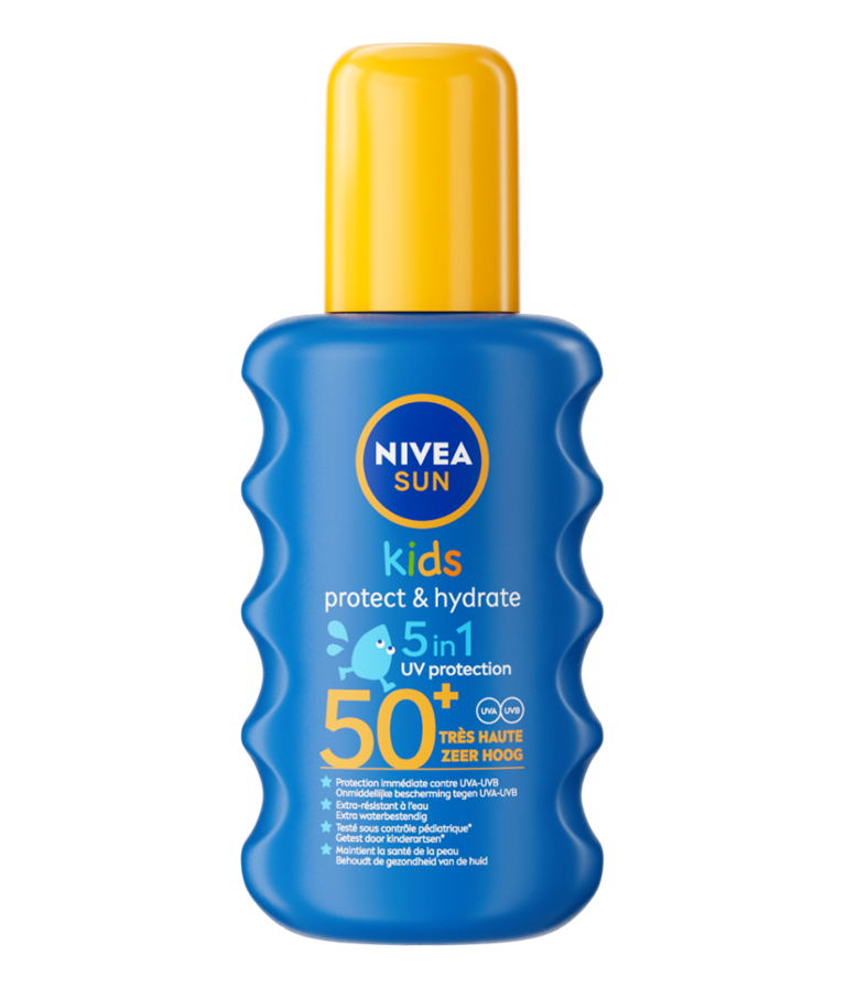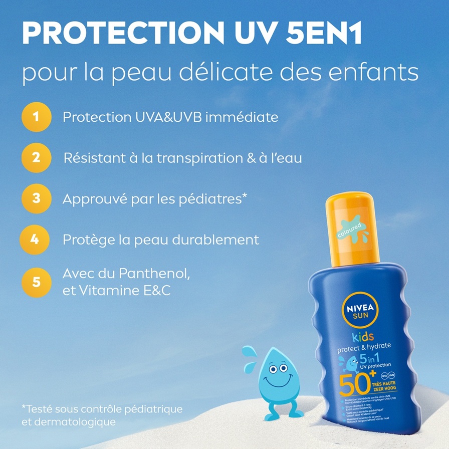 Le spray solaire Kids Protect & Hydrate SPF 50+ offre une protection 5 en 1. Il protège efficacement la peau des coups de soleil tout en offrant une hydratation à la peau.