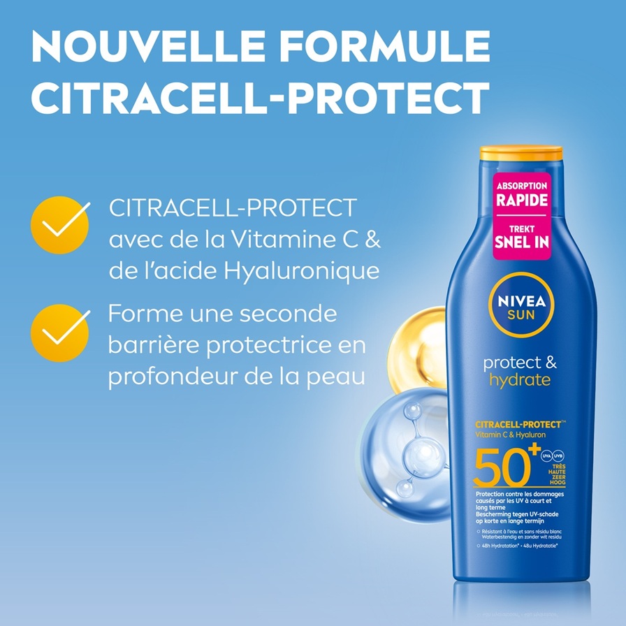 Protection fiable contre les dommages causés par les UV à court et à long terme grâce à la nouvelle formule CITRACELL-PROTECT™ à absorption rapide : Lait Protecteur NIVEA SUN Protect & Hydrate.