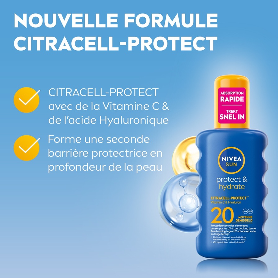 Protection fiable contre les dommages causés par les UV à court et à long terme grâce à la nouvelle formule CITRACELL-PROTECT™ à absorption rapide : Spray Protecteur NIVEA SUN Protect & Hydrate.