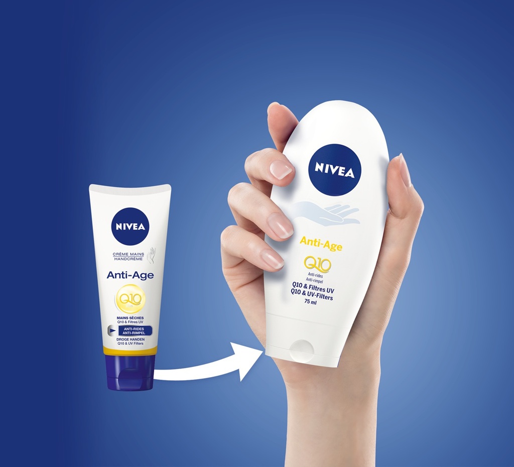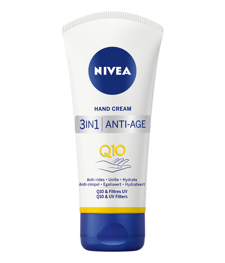 Probeer de NIVEA® 3in1 Anti-Age Hand Crème met Q10 & UV filters: De formule helpt het verschijnen van rimpels te verminderen, verzacht de huid van je handen en egaliseert je huidtextuur.
