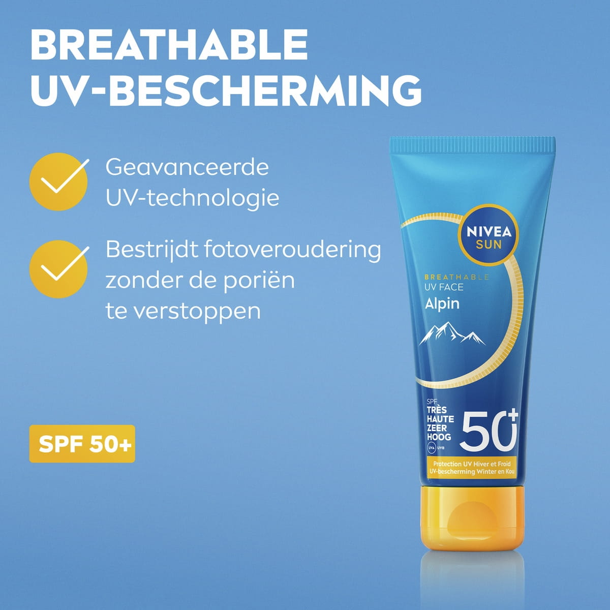 NIVEA SUN UV Face Alpin SPF 50+ bestrijdt fotoveroudering zonder de poriën te verstoppen. Beschermt bij koud weer en in de winter. Biedt 24 uur hydratatie*.