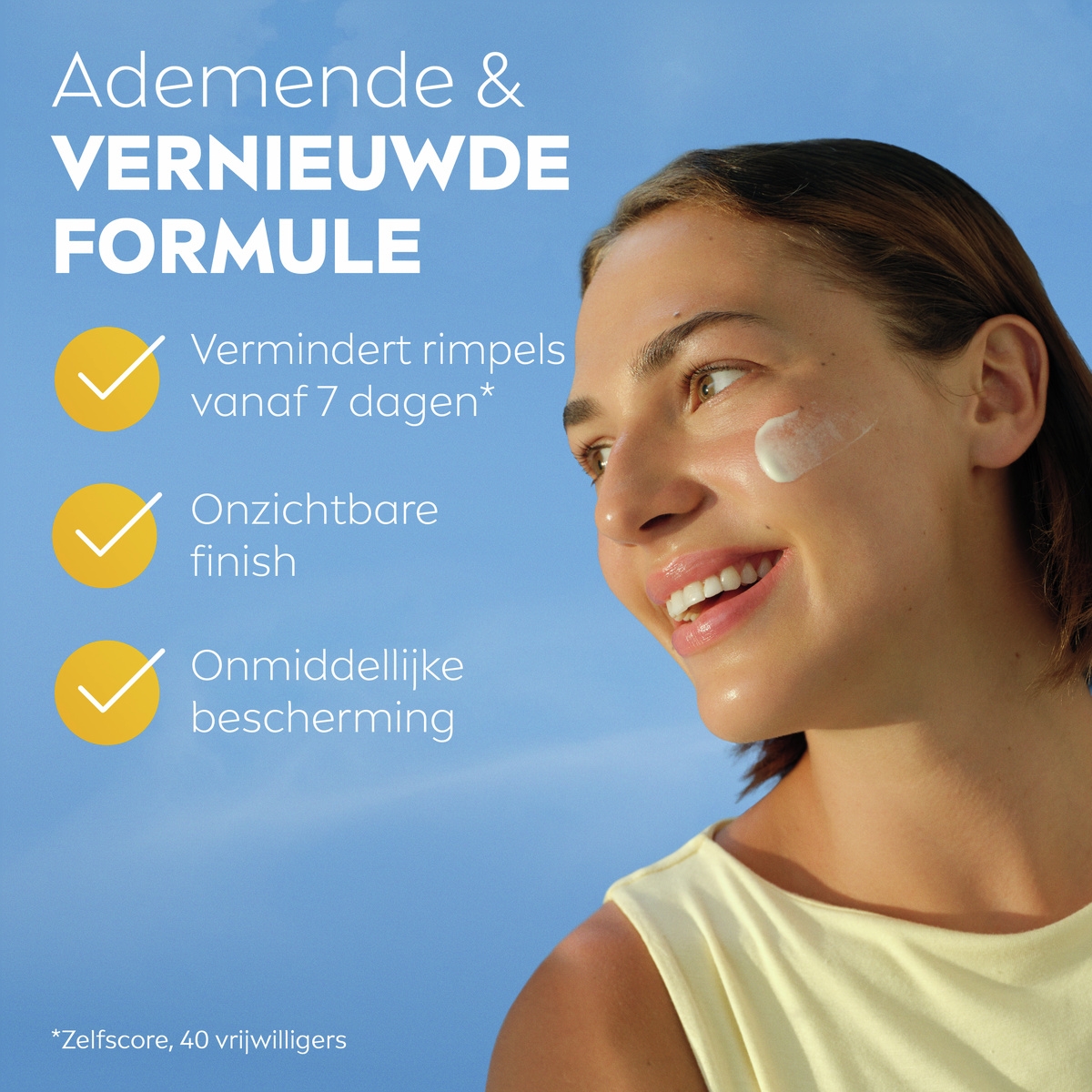 NIVEA SUN UV Face Anti-Age Q10 SPF 50+ bestrijding van fotoveroudering zonder de poriën te verstoppen. Vermindert rimpels en verstevigt de huid al na 7 dagen*.
