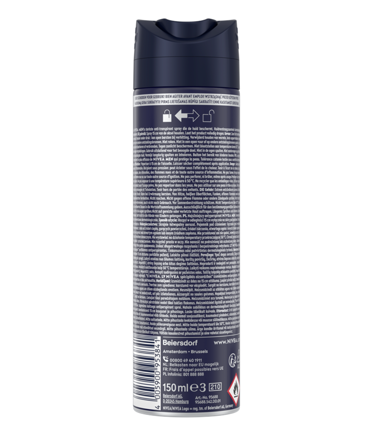 NIVEA MEN's sterkste anti-transpirant spray die de huid beschermt. Huidverdraagzaamheid dermatologisch goedgekeurd.