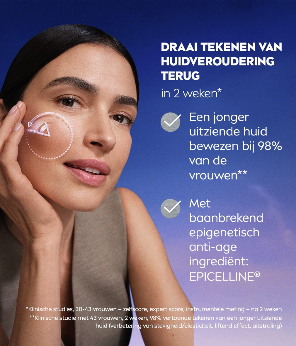 Ontdek een revolutie in huidverjonging – het nieuwe serum met het epigenetische ingrediënt EPICELLINE® heeft wetenschappelijk bewezen dat tekenen van huidveroudering in 2 weken* terugdraait. 98% bewezen huidverjonging**.