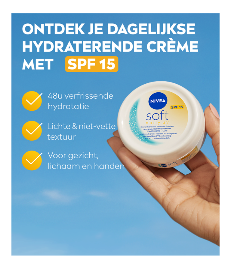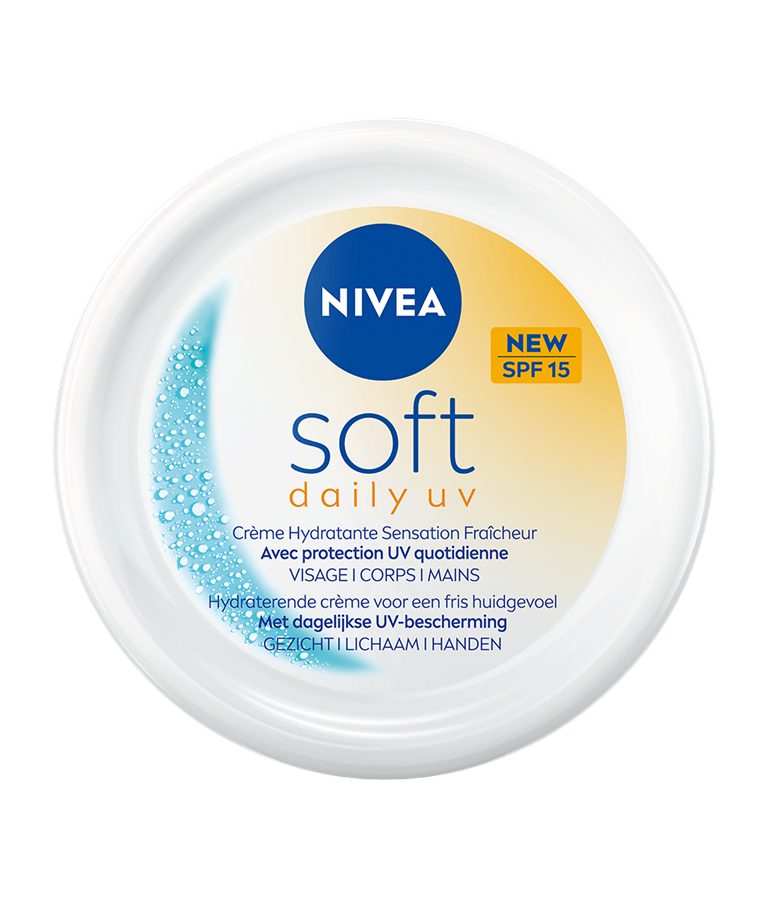 Geniet van de verfrissende, zachte hydratatie van NIVEA Soft Daily UV SPF 15 voor een gezonde, stralende huid.