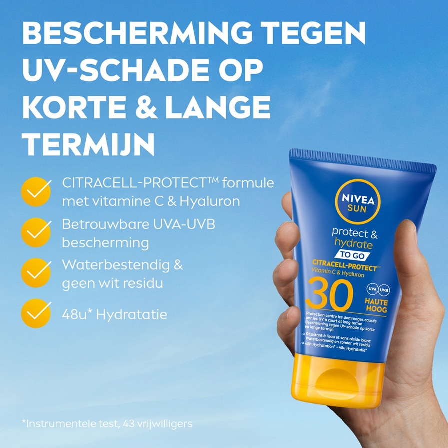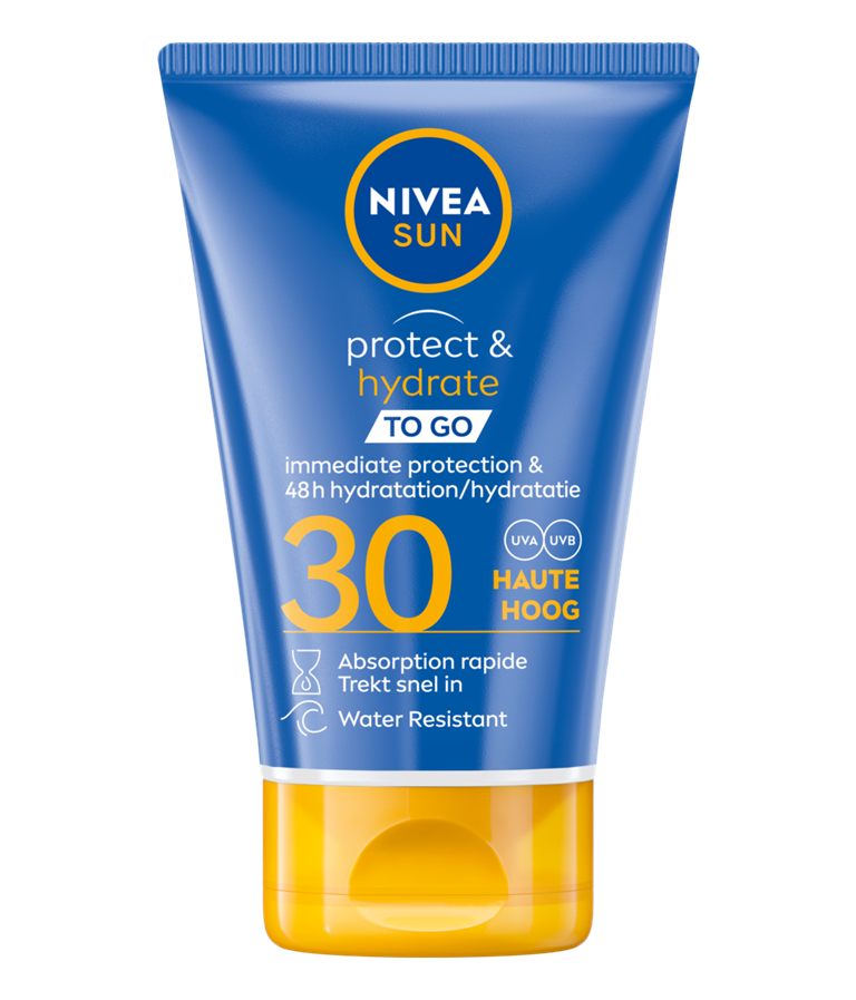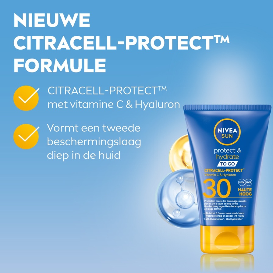 Betrouwbare bescherming tegen UV-schade op korte en lange termijn met de nieuwe snel absorberende CITRACELL-PROTECT™ formule : NIVEA SUN Protect & Hydrate melk TO GO.