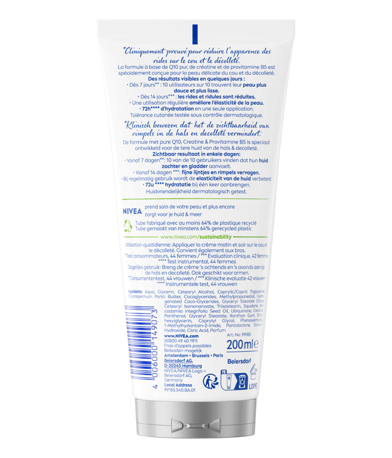 Zichtbaar resultaat in enkele dagen: - Vanaf 7 dagen**: 10 van de 10 gebruikers vinden dat hun huid zachter en gladder aanvoelt. - Vanaf 14 dagen ***: fijne lijntjes en rimpels vervagen. - Bij regelmatig gebruik wordt de elasticiteit van de huid verbeterd - 72u **** hydratatie bij één keer aanbrengen. **Consumententest, 44 vrouwen ***Klinische evaluatie 42 vrouwen ****Instrumentele test, 44 vrouwen