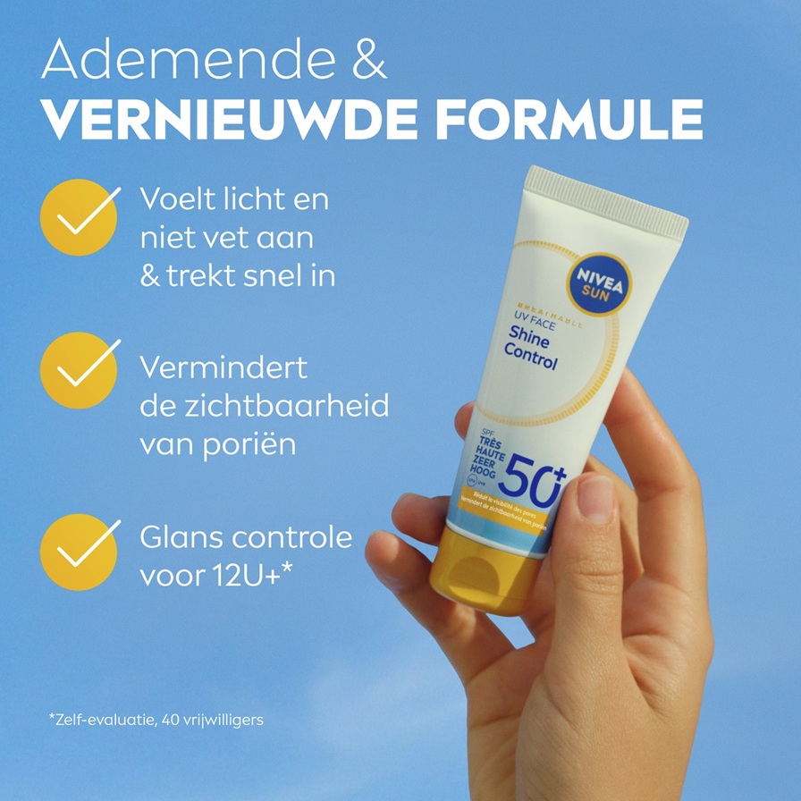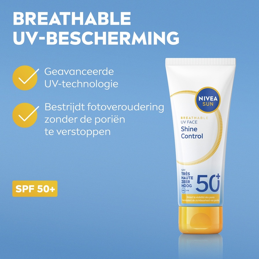 NIVEA SUN UV Face Shine Control SPF 50+ bestrijd de fotoveroudering zonder de poriën te verstoppen. Reguleert talg gedurende meer dan 12 uur* en vermindert het uiterlijk van de poriën.