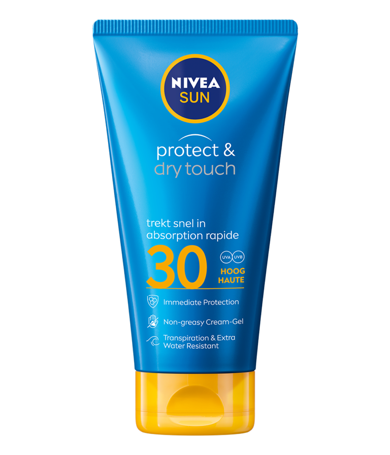 NIVEA SUN Protect & Dry Touch Crème-Gel onmiddellijk in je huid, laat geen vettig huidgevoel achter en je handen plakken niet na het aanbrengen. Crème-Gel is transparant op de huid.